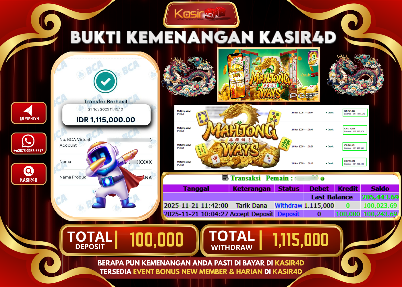 KASIR4D, Selamat Kepada User Id : DI ***** KA99 Atas Withdraw Hari ini Tgl 21 November2025Rp. 1.115.000 Di Game PG SOFT…