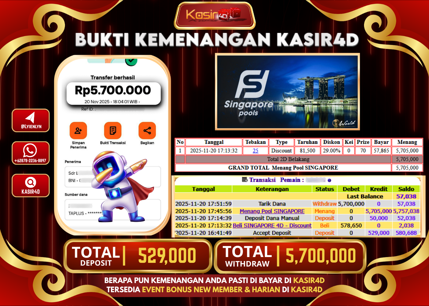 KASIR4D, Selamat Kepada User Id : LU ***** LUK10 Atas Withdraw Hari ini Tgl 20 November2025Rp. 5.700.000 Di Game PASARAN TOGEL…