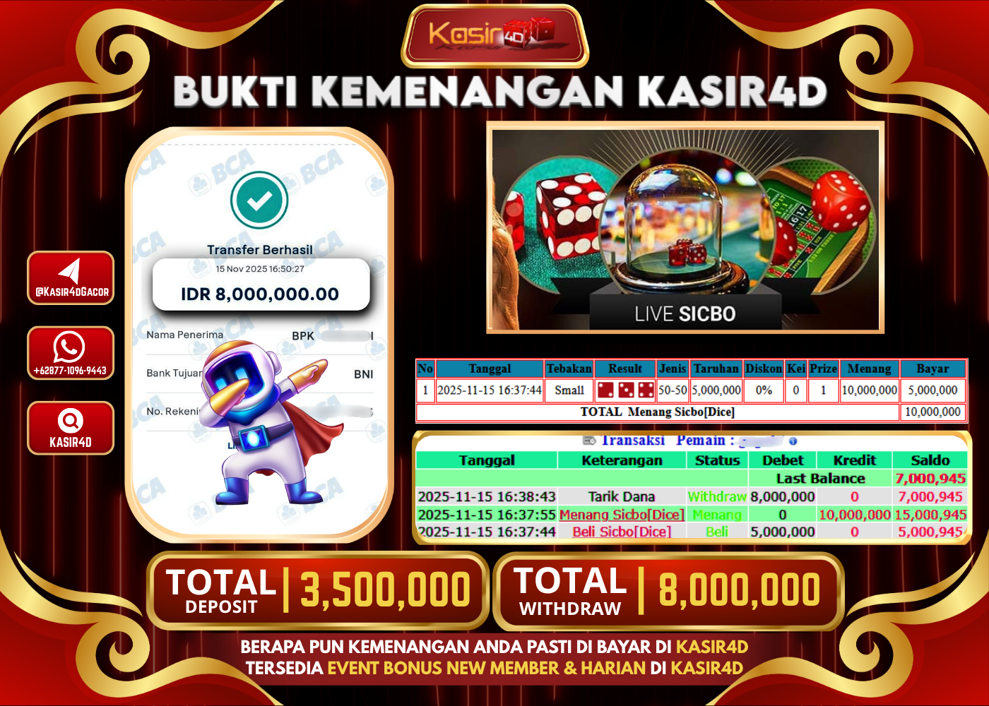KASIR4D, Selamat Kepada User Id : GO *****O67 Atas Withdraw Hari ini Tgl 15 November 2025Rp. 8.000.000 Di Game LIVE CASINO…