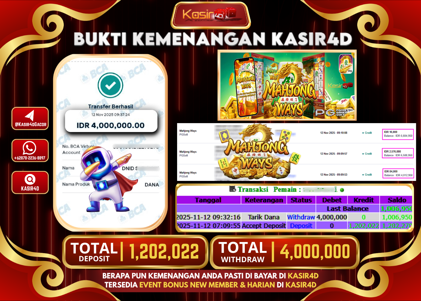 KASIR4D, Selamat Kepada User Id : KI*****RUN88 Atas Withdraw Hari ini Tgl 12 November 2025Rp. 4.000.000 Di Game PG SOFT MAHJONG…