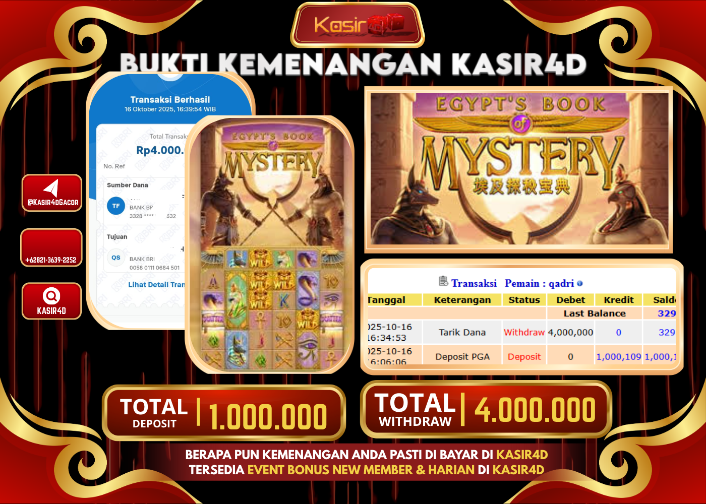 KASIR4D,Selamat Kepada User Id : G***LN Atas Withdraw Hari iniTgl 16 Oktober 2025 Rp.4.000.000 Di Game Pg Soft EGYPT S BOOK OF MYSTERY…