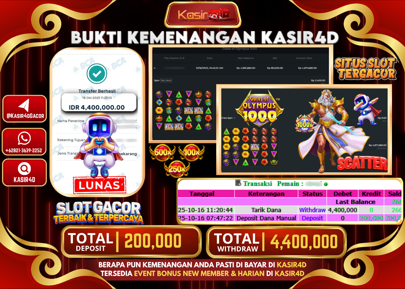 KASIR4D, Selamat Kepada User Id : Di*****dic78 Atas Withdraw Hari ini Tgl 16 Oktober 2025Rp. 4,400,000 Di Game PRAGMATIC PLAY GATES…