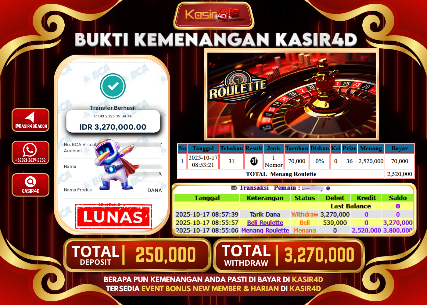 KASIR4D, Selamat Kepada User Id : Far*****tun99 Atas Withdraw Hari ini Tgl 17 Oktober 2025Rp. 3,270,000 Di Game LIVE CASINO ROULETTE…