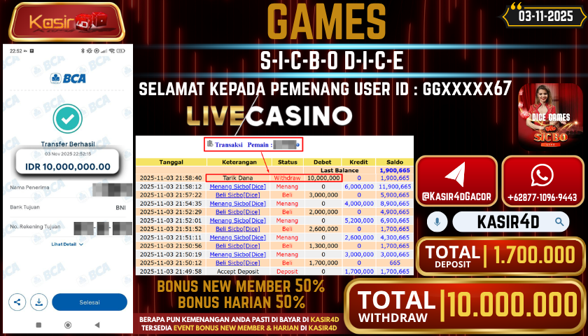 KASIR4D,Selamat Kepada User Id : GGXXXXX67 Atas Withdraw Hari ini Tgl 03 November 2025 Rp.10.000.000 Di Game Live Casino Sicbo[Dice] INFORMASI LENGKAP TERKAIT…