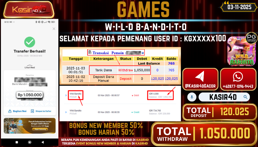 KASIR4D,Selamat Kepada User Id : KGXXXXX100 Atas Withdraw Hari ini Tgl 03 November 2025 Rp.1.050.000 Di Game Pg Soft Wild Bandito INFORMASI LENGKAP…