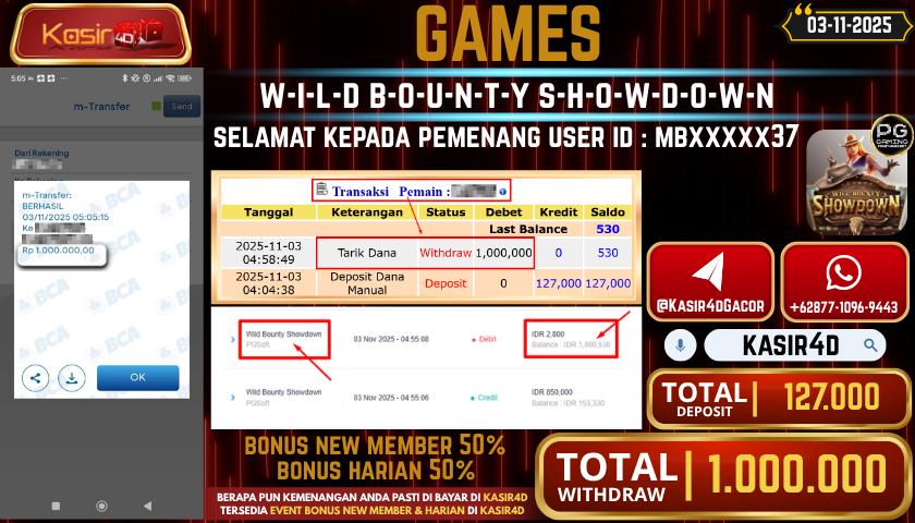 KASIR4D,Selamat Kepada User Id : MBXXXXX37 Atas Withdraw Hari ini Tgl 03 November 2025 Rp.1.000.000 Di Game Pg Soft Wild Bounty Showdown INFORMASI…