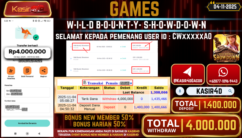 KASIR4D,Selamat Kepada User Id : CWXXXXXAO Atas Withdraw Hari ini Tgl 04 November 2025 Rp.4.000.000 Di Game Pg Soft Wild Bounty Showdown INFORMASI…