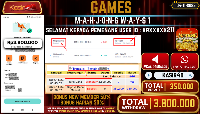 KASIR4D,Selamat Kepada User Id : KRXXXXX211 Atas Withdraw Hari ini Tgl 04 November 2025 Rp.3.800.000 Di Game Pg Soft Mahjong Ways 1 INFORMASI…