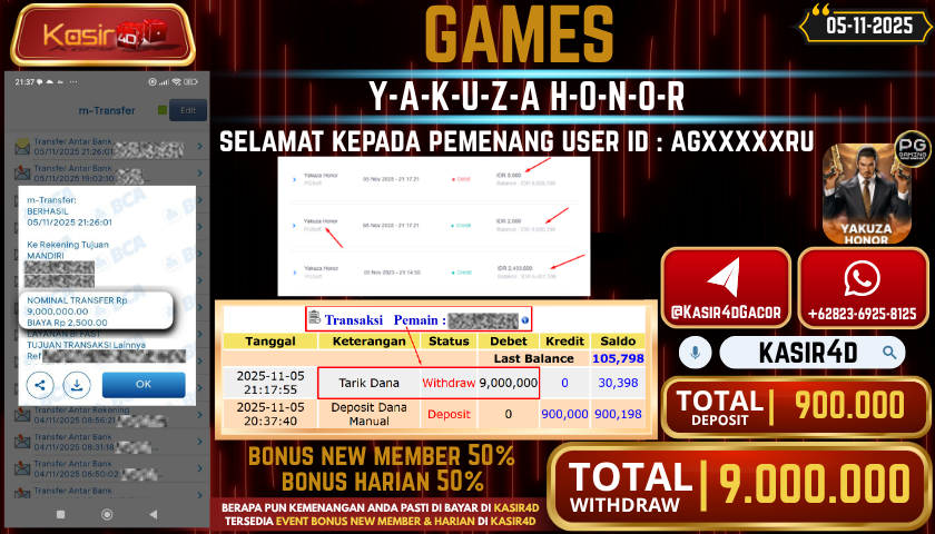 KASIR4D,Selamat Kepada User Id : AGXXXXXRU Atas Withdraw Hari ini Tgl 05 November 2025 Rp.9.000.000 Di Game Pg Soft Yakuza Honor INFORMASI LENGKAP…