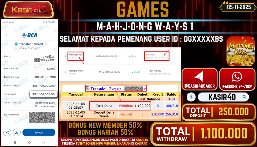 KASIR4D,Selamat Kepada User Id : DGXXXXXBS Atas Withdraw Hari ini Tgl 05 November 2025 Rp.1.100.000 Di Game Pg Soft Mahjong Ways 1 INFORMASI…