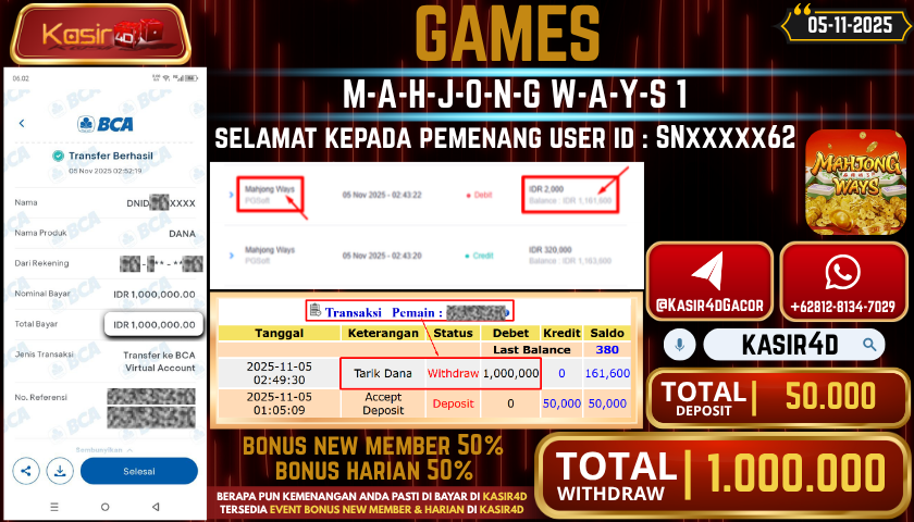KASIR4D,Selamat Kepada User Id : SNXXXXX62 Atas Withdraw Hari ini Tgl 05 November 2025 Rp.1.000.000 Di Game Pg Soft Mahjong Ways 1 INFORMASI…
