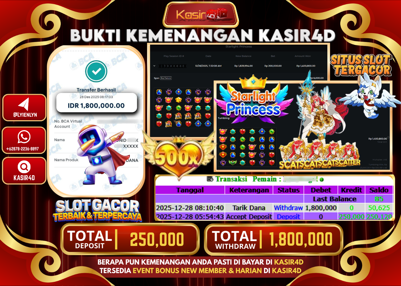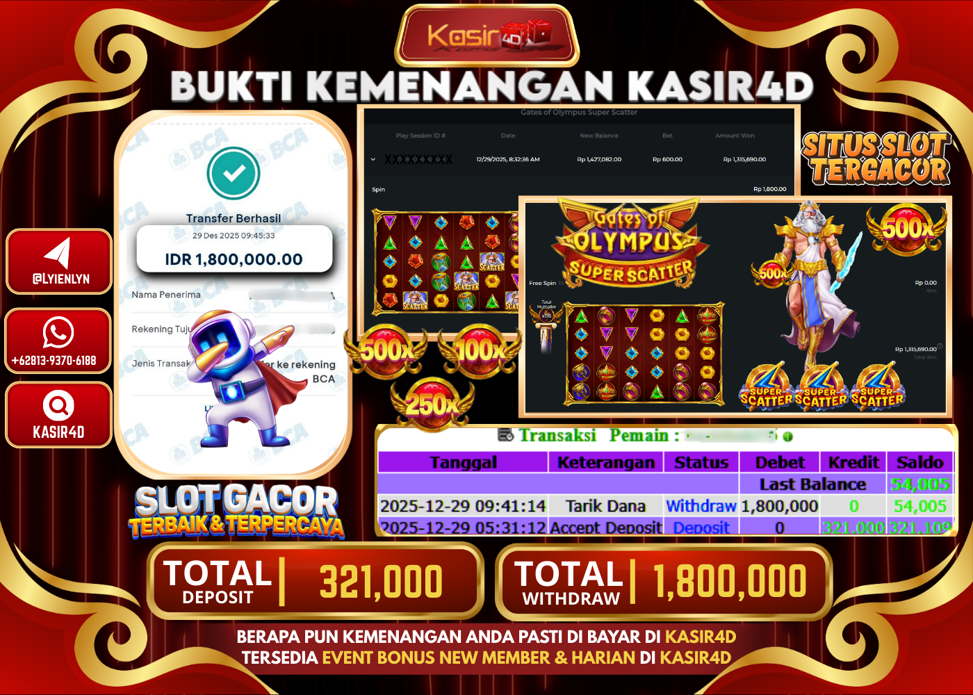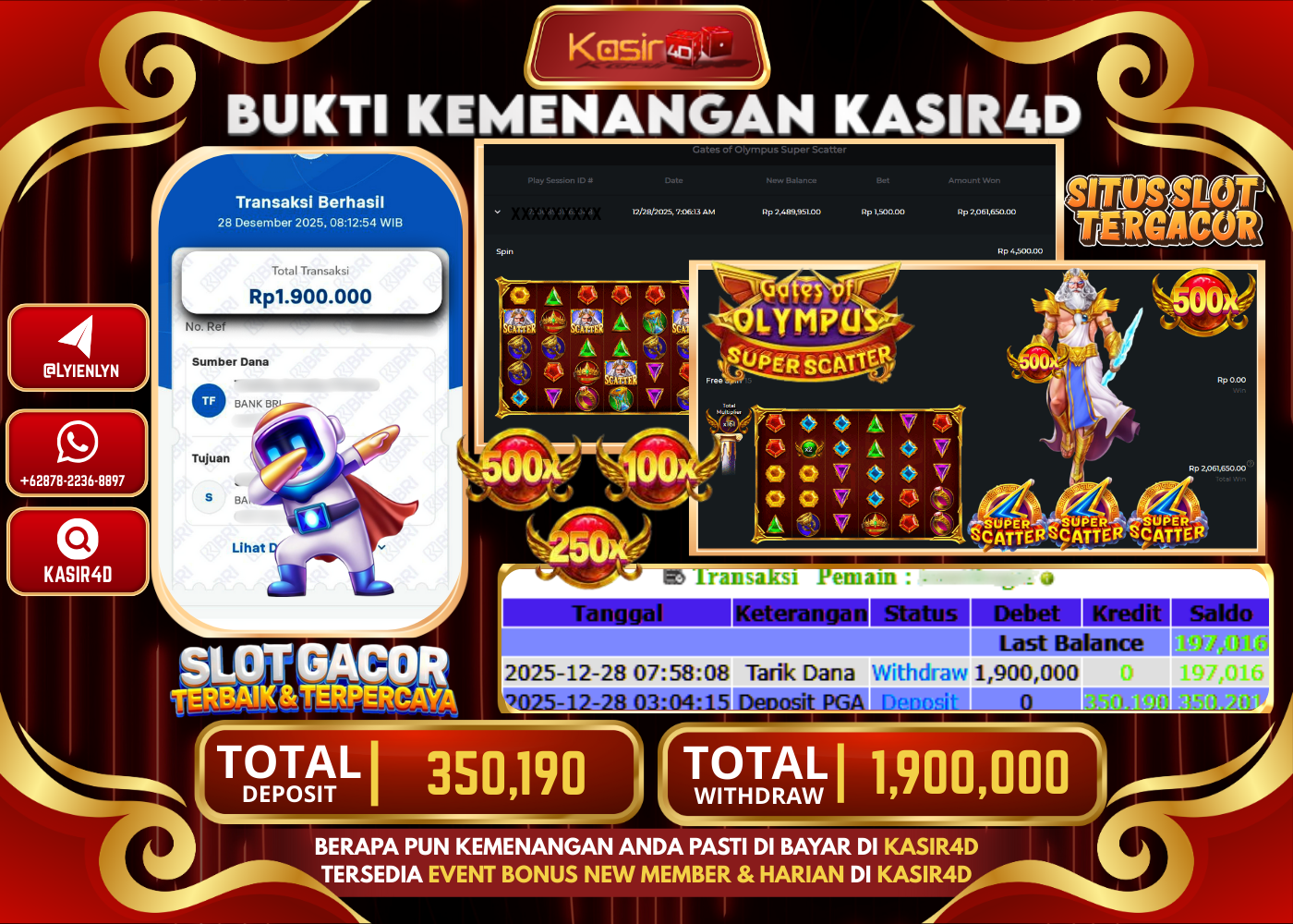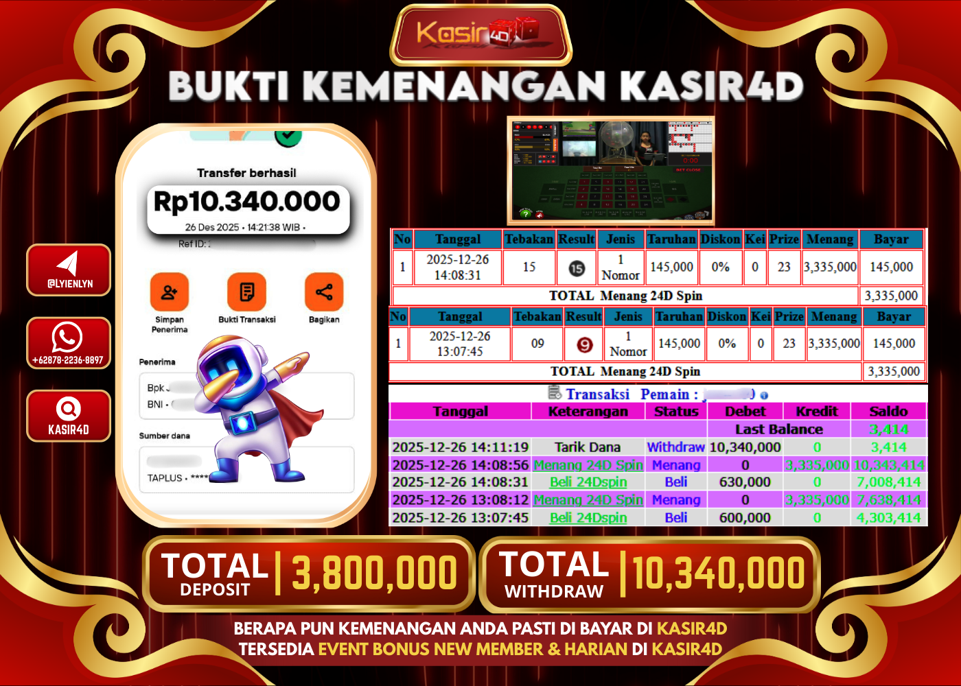 KASIR4D, Selamat Kepada User Id : JA ***** ES80 Atas Withdraw Hari ini Tgl 26 Desember 2025Rp. 10.340.000 Di Game LIVE…