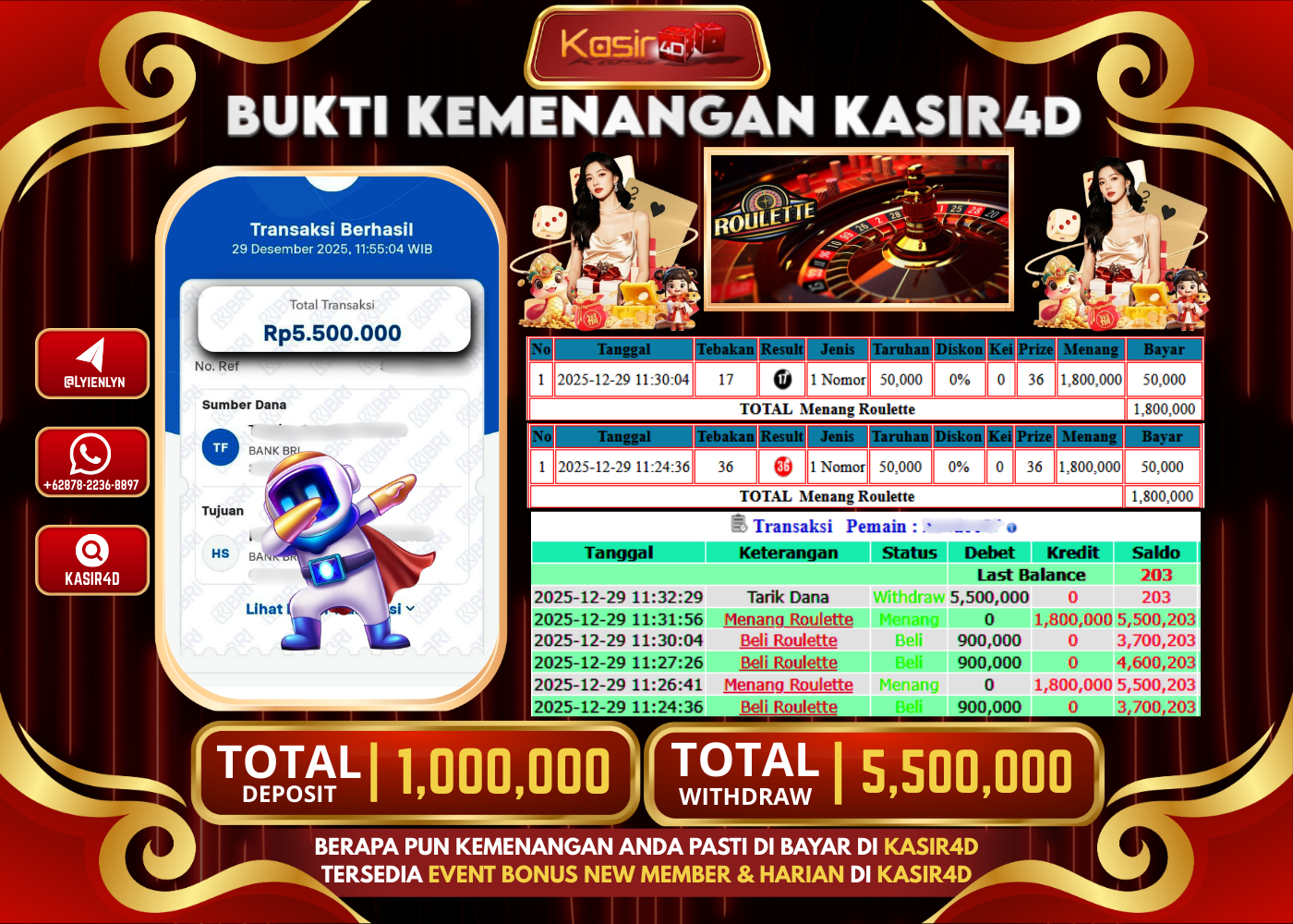 KASIR4D, Selamat Kepada User Id : HA ***** OO87 Atas Withdraw Hari ini Tgl 29 Desember 2025Rp. 5.500.000 Di LIVE GAME…