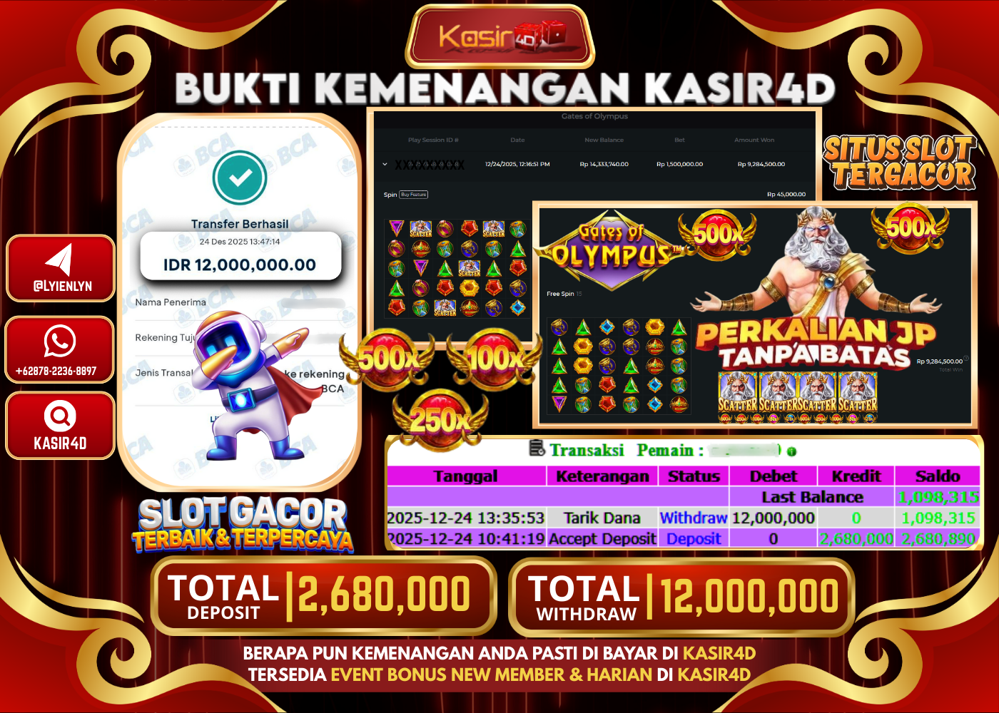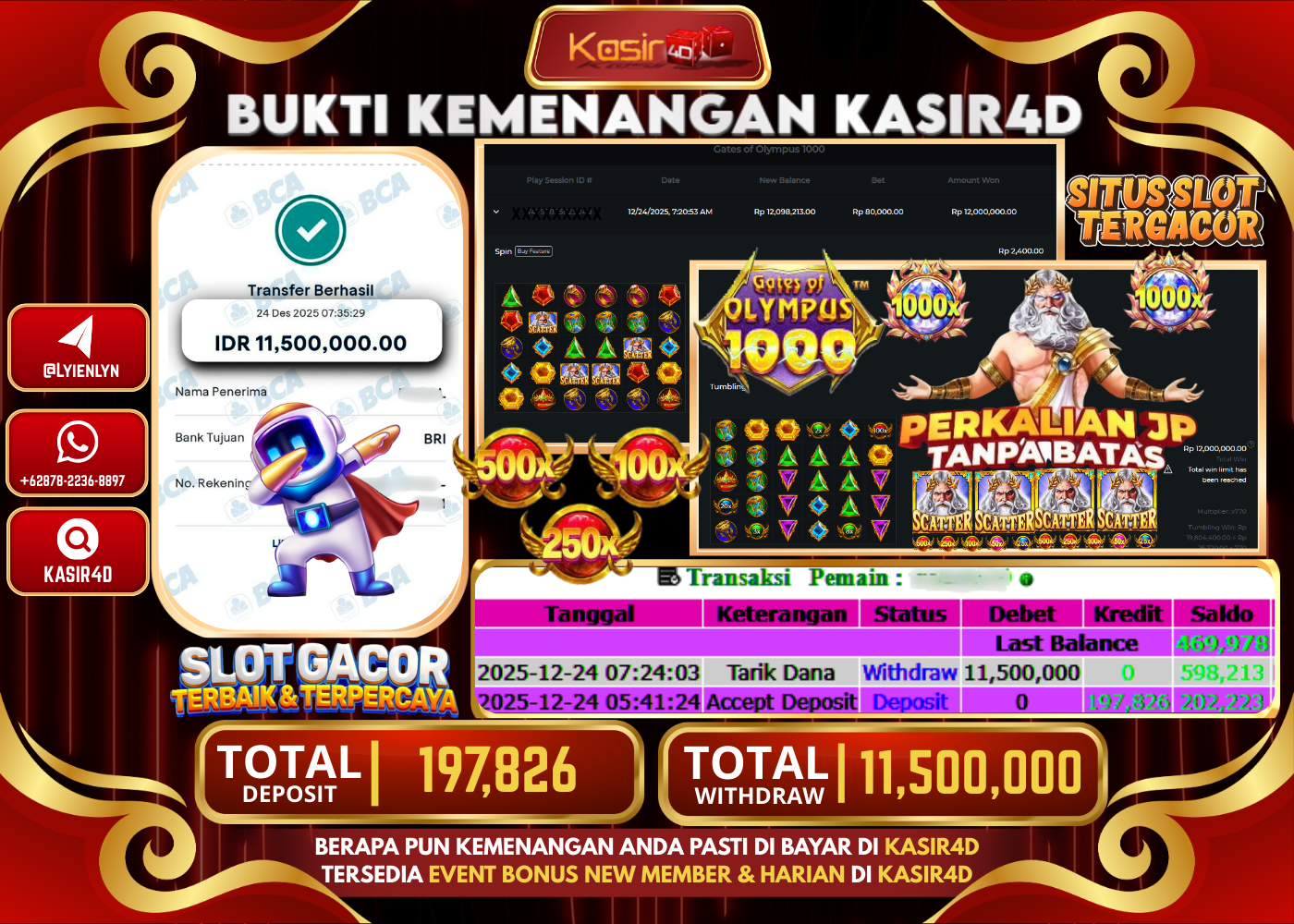 KASIR4D, Selamat Kepada User Id : WA ***** DA10 Atas Withdraw Hari ini Tgl 24 Desember 2025Rp. 11.500.000 Di Game PRAGMATIC…