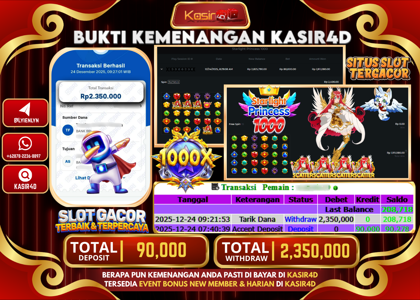 KASIR4D, Selamat Kepada User Id : AN ***** DI77 Atas Withdraw Hari ini Tgl 24 Desember 2025Rp. 2.350.000 Di Game PRAGMATIC…
