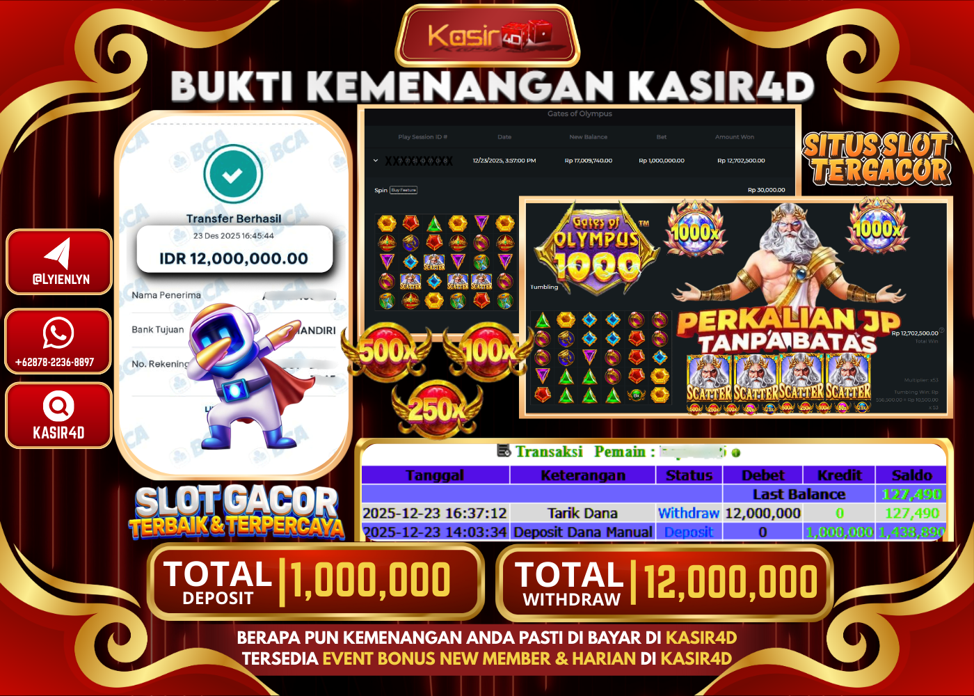 KASIR4D, Selamat Kepada User Id : BO ***** II24 Atas Withdraw Hari ini Tgl 23 Desember 2025Rp. 12.000.000 Di Game PRAGMATIC…