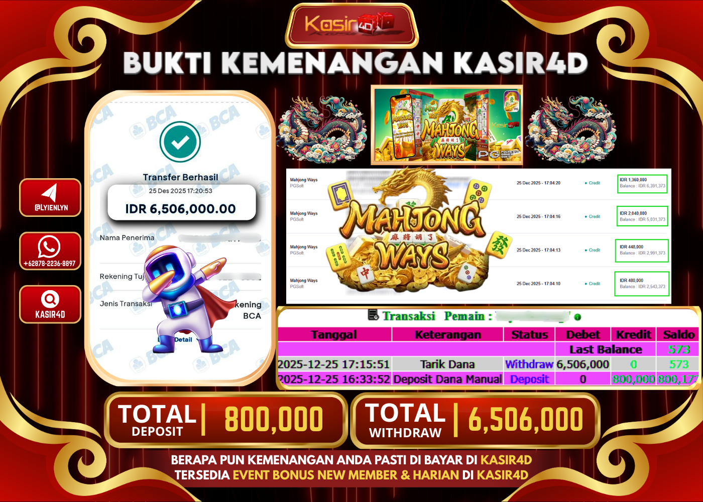 KASIR4D, Selamat Kepada User Id : BA***** ANG7 Atas Withdraw Hari ini Tgl 25 Desember 2025Rp. 6.506.000 Di Game PG SOFT…