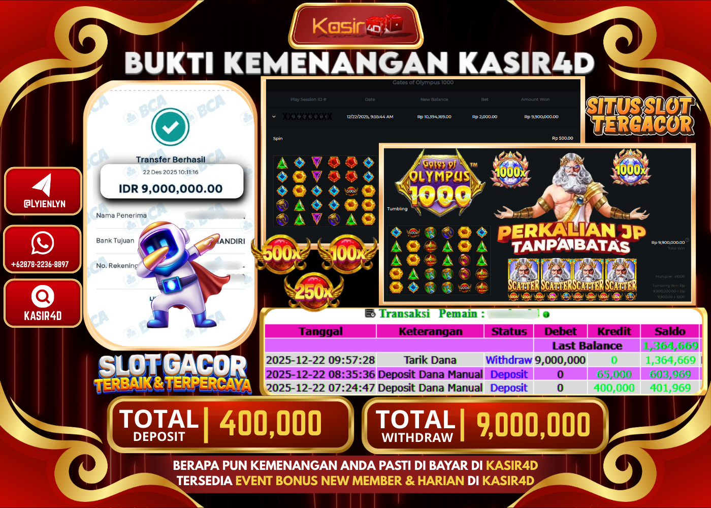 KASIR4D, Selamat Kepada User Id : TU ***** UR14 Atas Withdraw Hari ini Tgl 22 Desember 2025Rp. 9.000.000 Di Game PRAGMATIC…