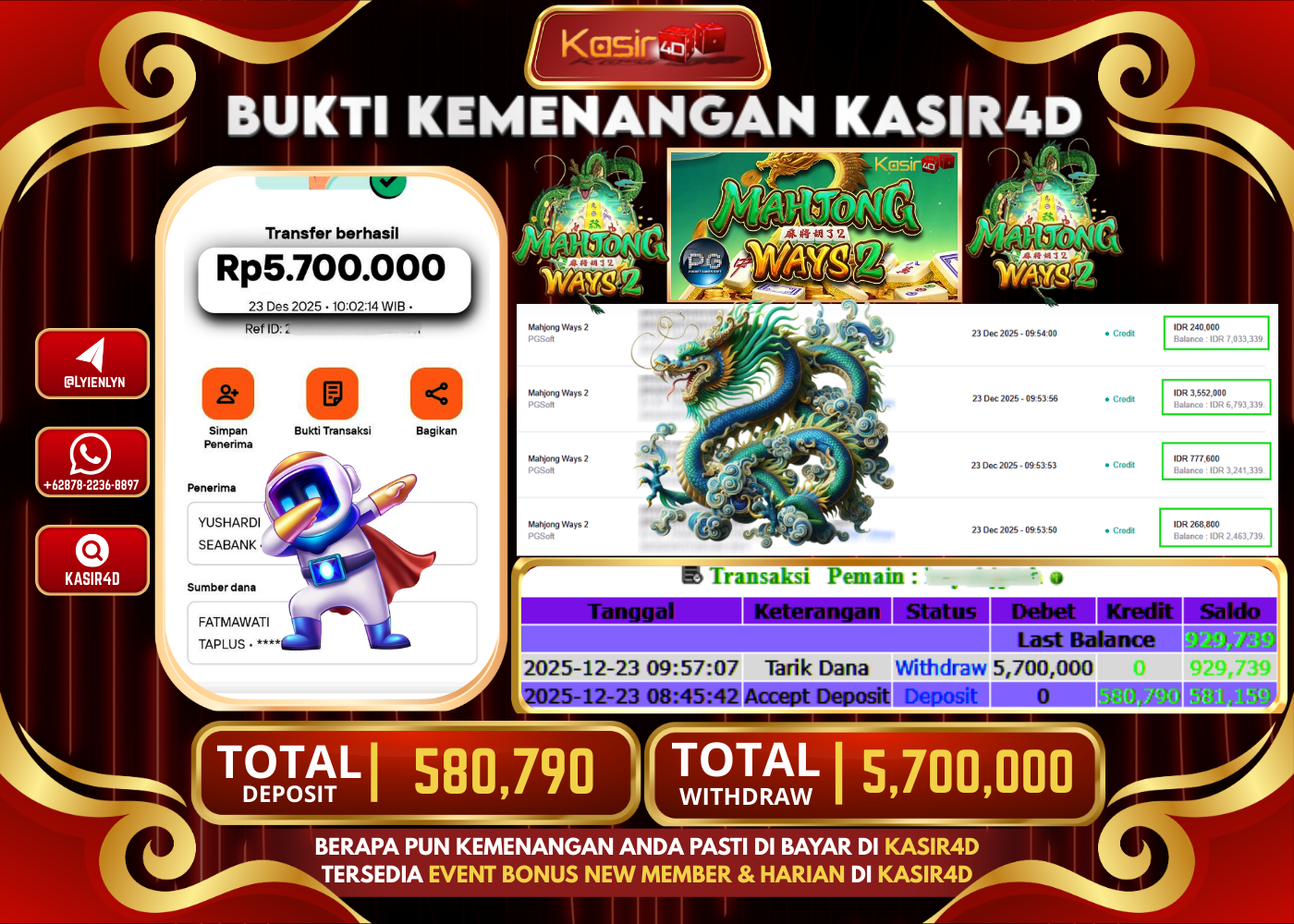 KASIR4D, Selamat Kepada User Id : KU ***** PLAH12 Atas Withdraw Hari ini Tgl 23 Desember 2025Rp. 5.700.000 Di Game PG…