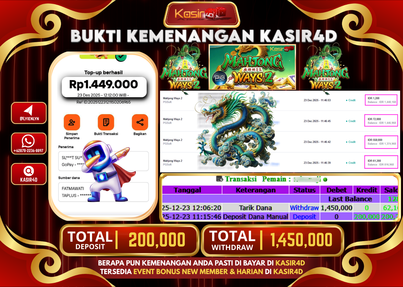 KASIR4D, Selamat Kepada User Id : SU ***** NAJI Atas Withdraw Hari ini Tgl 23 Desember 2025Rp. 1.450.000 Di Game PG…