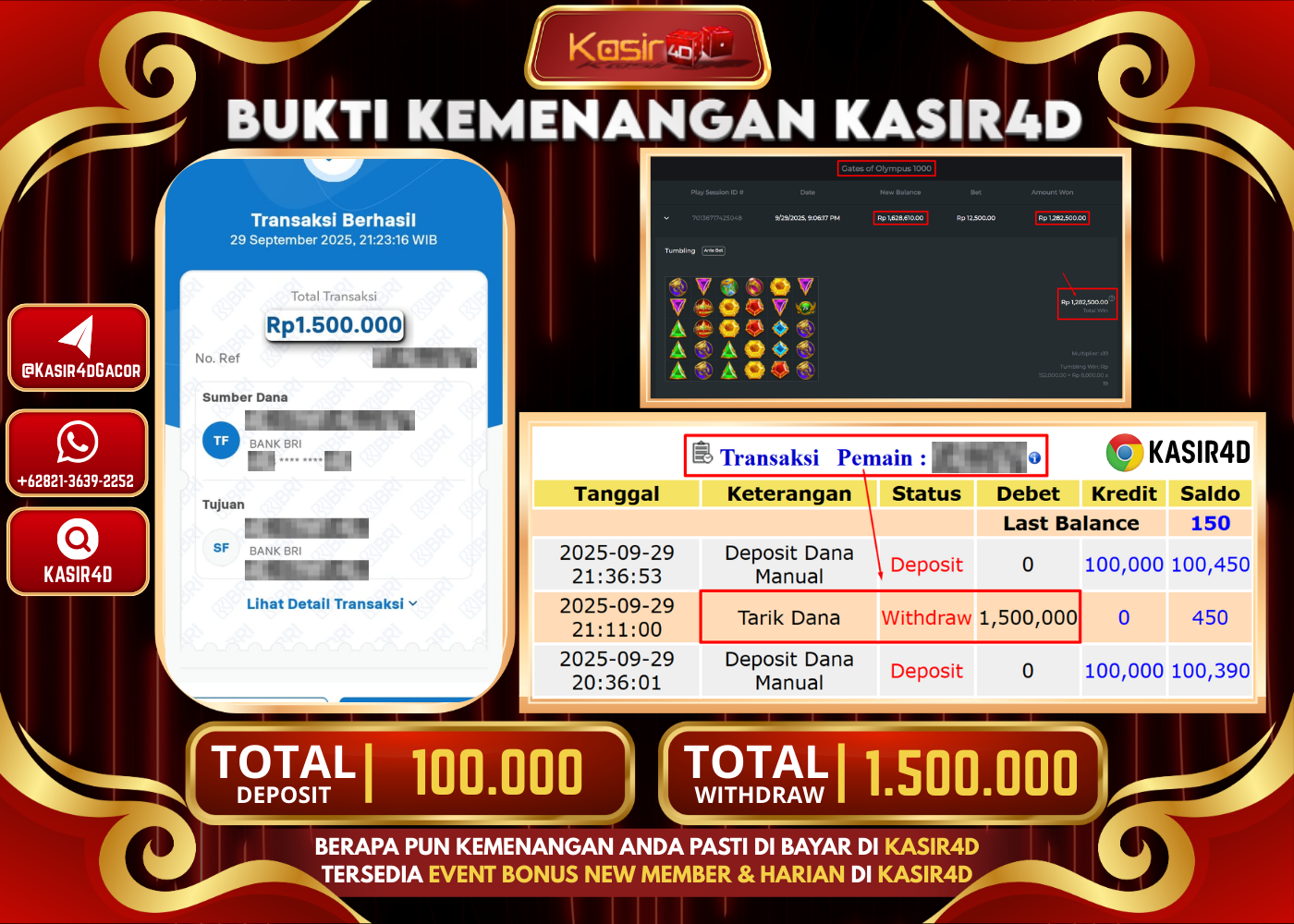 • KASIR4D,Selamat Kepada User Id : PY*****93 Atas Withdraw Hari ini Tgl 29 September 2025 Rp.1.500.000 Di Game Pragmatic Play Gates of Olympus 1000 INFORMASI…
