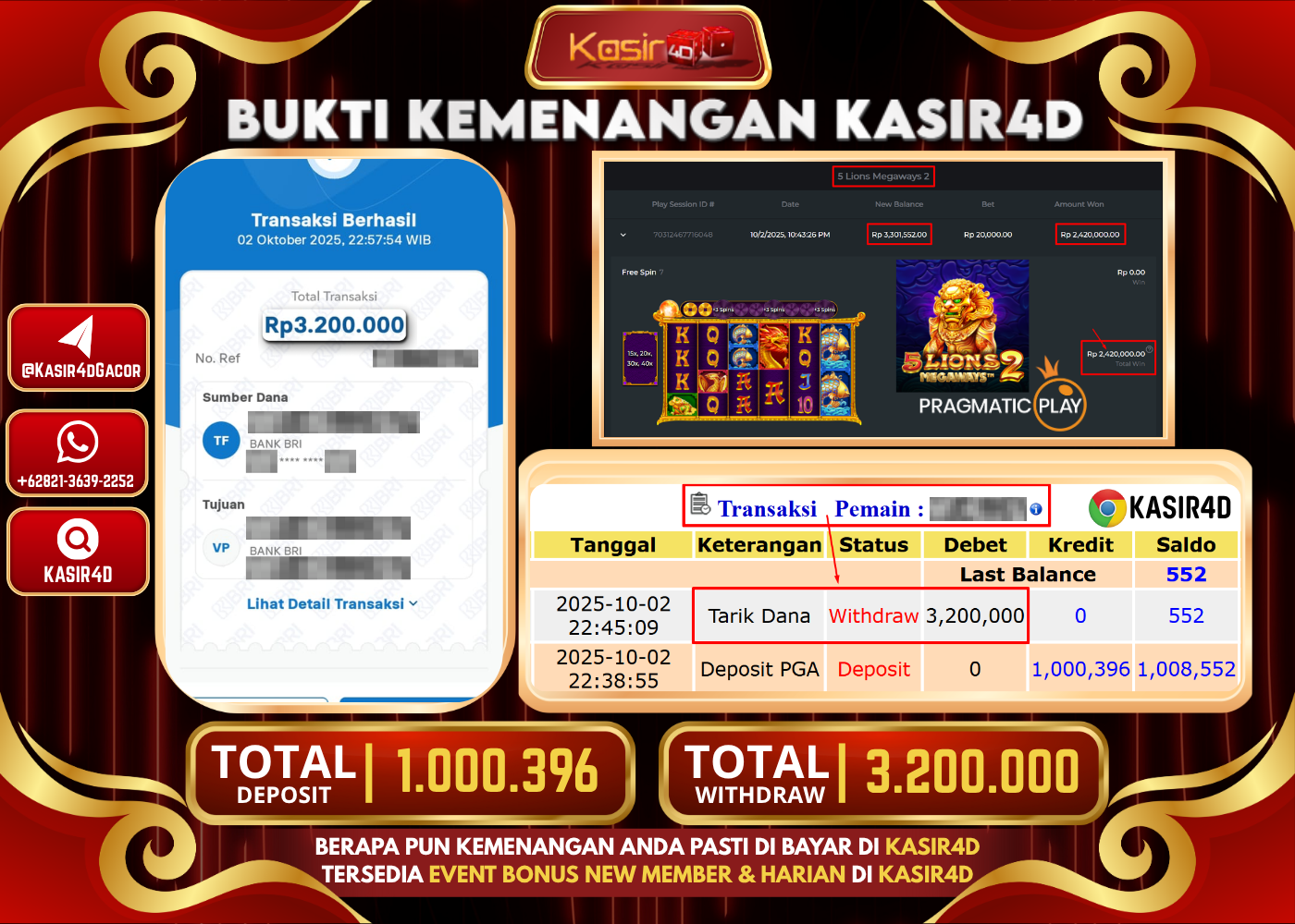 • KASIR4D,Selamat Kepada User Id : HK*****01 Atas Withdraw Hari ini Tgl 02 Oktober 2025 Rp.3.200.000 Di Game Pragmatic Play 5 Lions Megaways 2 INFORMASI…