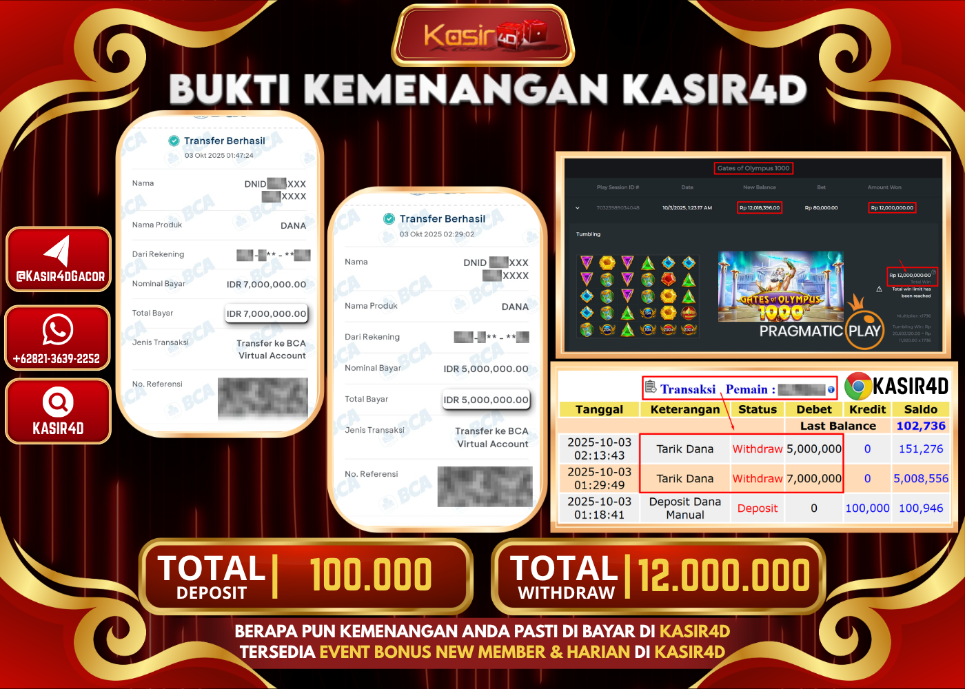 • KASIR4D,Selamat Kepada User Id : SR*****50 Atas Withdraw Hari ini Tgl 03 Oktober 2025 Rp.12.000.000 Di Game Pragmatic Play Gates Of Olympus 1000…